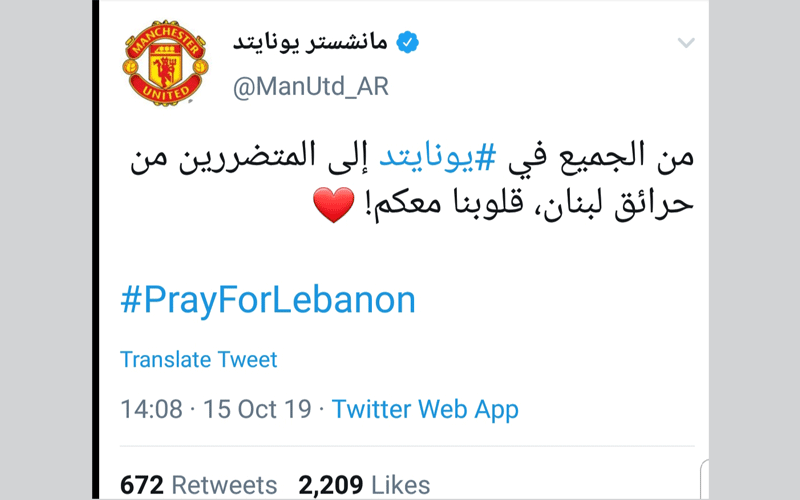 ومن أوروبا، وصلت تغريدة إلى لبنان من نادي مانشستر يونايتد، الذي كتب على حسابه: "من الجميع في يونايتد إلى المتضررين من حرائق لبنان، قلوبنا معكم!”، وأرفق التغريدة بهاشتاغ