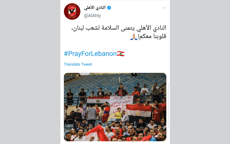 وليس ببعيد عن صلاح، وجه النادي الأهلي المصري تغريدة تضامن مع لبنان، وقال على حسابه: "مصر ولبنان شعب واحد"، وكتب على الصورة المرفقة: "قلوبنا مع لبنان.. الصلاة من أجل لبنان".