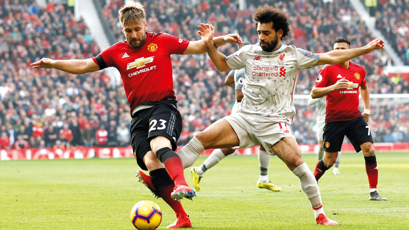 محمد صلاح في صراع على الكرة مع لاعب مان يونايتد لوك شو في لقاء سابق. أ.ف.ب