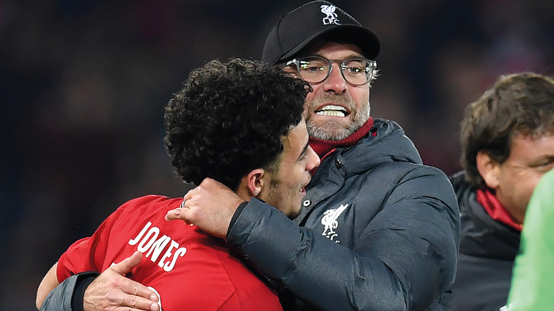 كلوب يحتفل مع لاعبه كورتيس بعد الفوز على أرسنال. أ.ف.ب