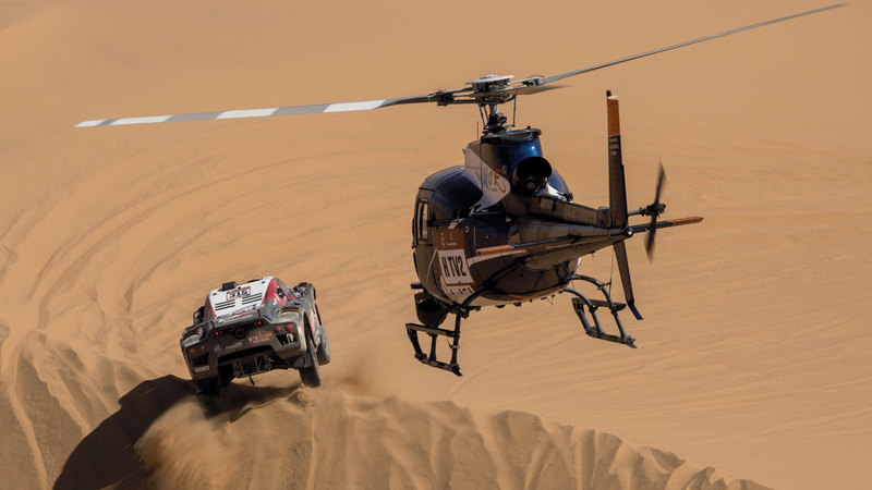 سيارة ماثيو سيرادوري من فرنسا وفابيان لوركين من بلجيكا، خلال المرحلة السابعة من رالي دكار بين الرياض ووادي الدواسر في السعودية أمس.