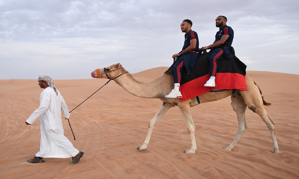 بالصور.. لاعبو ارسنال وعائلاتهم يستمتعون بعشاء عربي في صحراء دبي ويركبون الجمال