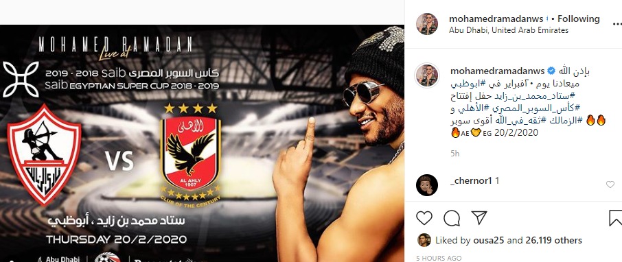 عاد الفنان المصري محمد رمضان لإثارة الجدل في الشارع المصري بعدما نشر على حسابه الرسمي على موقع التواصل الإجتماعي إنستغرام، صوره يروج من خلالها للحفل الذي سيقام على هامش مباراة السوبر المصري الذي سيجع الأهلي والزمالك الخميس المقبل في أبوظبي، إذ حذف لاحقا هذا المنشور عقب الأزمة التي حدثت معه أخيراً بينه وبين الطيار المصري أشرف أبو اليسر.
