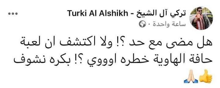 وقال آل الشيخ عبر صفحته الرسمية على موقع التواصل الاجتماعي "فيس بوك": "هل مضى مع حد؟! ولا اكتشف أن لعبة حافة الهاوية خطره أوي؟! بكرة نشوف".