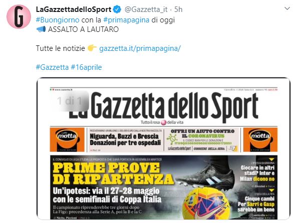 كشفت صحيفة "غازيتا ديلو سبورت" الإيطالية بأن رابطة كرة القدم الإيطالية تدرس عودة النشاط الرياضي الكروي في البلاد يومي في 27 و28 مايو المقبل، بإقامة مباراتي إياب الدور نصف النهائي لمسابقة كأس إيطاليا، وذلك لوضع حد لحالة التوقف الطويلة التي تمر بها الكرة العالمية بسبب تفشي فيروس كورونا (كوفيد 19).
