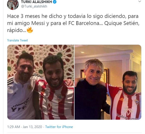 ونشر آل الشيخ، عبر «تويتر»، يوم 12 يناير 2020، تغريدة أرفق خلالها صورتين له رفقة ميسي وسيتين، قائلاً بالإسبانية: «منذ ثلاثة أشهر قلت ومازلت أقول ذلك لصديقي ميسي ولبرشلونة.. استقدام كيكي سيتين بسرعة».