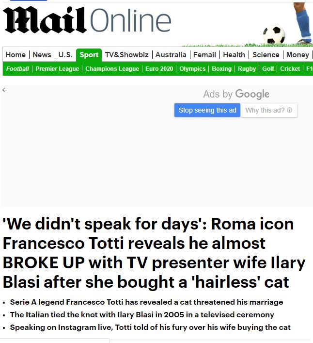 وأوضح توتي لموقع "ميل أون لاين" البريطاني أن "قطة بلا شعر تهدد حياتي الزوجية.. كنت غاضبا من زوجتي بعدما اشترت قطة بلا شعر وسمتها دونا باولا، وأصبحت علاقتنا متوترة جدا بسبب تلك القطة".
