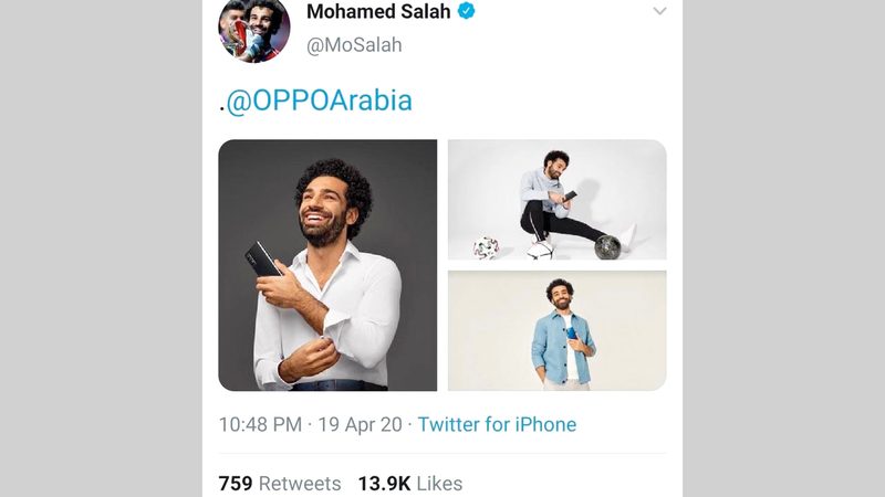 نشر اللاعب المصري محمد صلاح تغريدة على حسابه الشخصي في موقع التواصل الاجتماعي «تويتر»، قبل أن يقوم بحذفها بسبب ارتكابه خطأً فادحاً قد يكلفه خسارة الملايين من الدولارات. وتعاقد لاعب ليفربول الإنجليزي مع شركة أوبو للهواتف، إذ نشر صوراً لأحدث هواتف الشركة، ولكن النجم المصري، استخدم هاتفه الآيفون، لتظهر الدعاية للشركة عن طريق شركة منافسة. وقام صلاح بحذف التغريدة، وذلك بعد تلقيه انتقادات من متابعيه بسبب هذا الخطأ الفادح، الذي قد يكلفه خسارة تعاقده مع شركة أوبو.