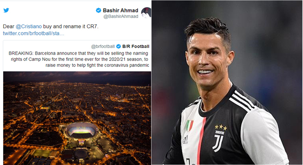 وقال بشري أحمد في تغريدة على حسابه في (تويتر): "عزيزي كريستيانو، لماذا لا تشتري ملعب "كامب نو"، وتطلق اسم "CR7" عليه"، في إشارة إلى اسم "كريستيانو رونالدو"، والرقم الشهير الذي عادة ما يزين القميص الذي يلعب به رونالدو، وهو "7".