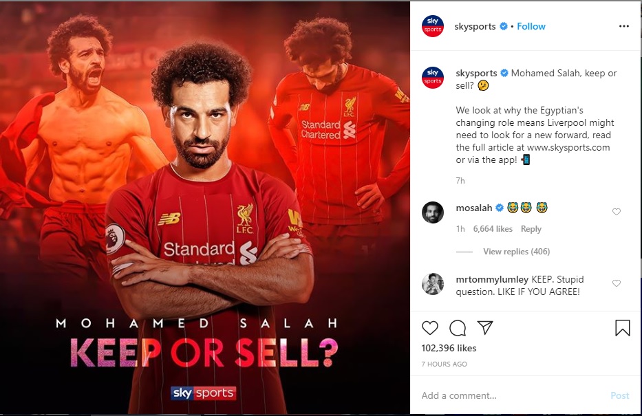 ورد صلاح على المنشور، بوضع 3 وجوه تعبيرية ساخرة، إذ تفاعل متابعو شبكة سكاي سبورتس مع رد اللاعب المصري، مؤكدين أن ليفربول سيخسر في حال بيعه لهداف الفريق الأول في آخر موسمين.
