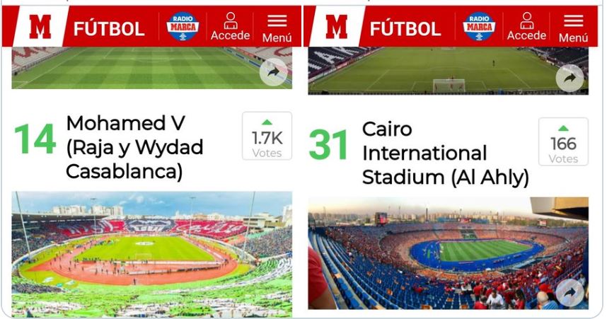 وأثارت الصحيفة الإسبانية استياء جماهير الزمالك خصوصاً أنها حين أشركت استاد محمد الخامس في المغرب ضمن المرشحين للفوز بالاستفتاء ذكرت بأن الملعب يخص ناديي الوداد والرجاء معاً.