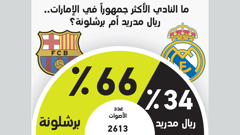 تفوق أنصار نادي برشلونة على أنصار نظيره ريال مدريد في استفتاء «الأندية الأكثر جمهوراً في الإمارات»، ضمن سلسلة استطلاعات أجرتها «الإمارات اليوم» على منصاتها في مواقع التواصل الاجتماعي، بحصوله على 66% من إجمالي الأصوات البالغة 2613 مشاركاً، مقابل 34% لريال مدريد.