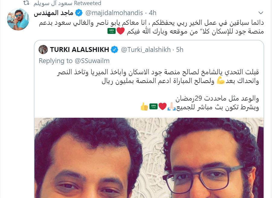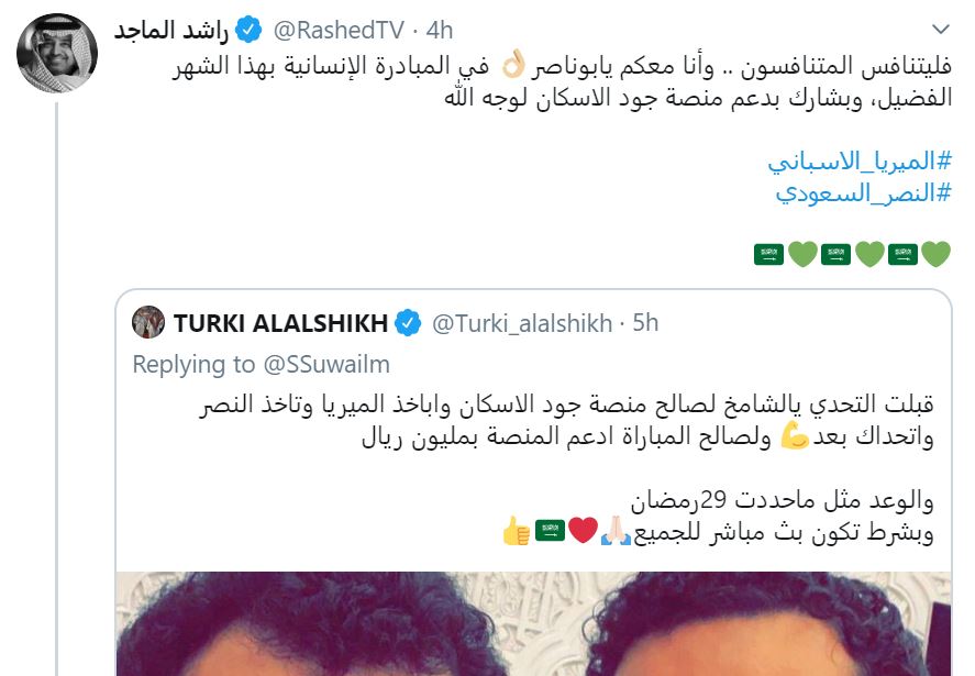 من جهته، رد تركي آل الشيخ عبر حسابه: " قبلت التحدي يالشامخ (لقب آل سويلم) لصالح منصة جود الاسكان وأباخذ ألميريا وتاخذ النصر وأتحداك بعد.. ولصالح المباراة ادعم المنصة بمليون ريال والوعد مثل ما حددت 29 رمضان، وبشرط تكون بث مباشر للجميع".
