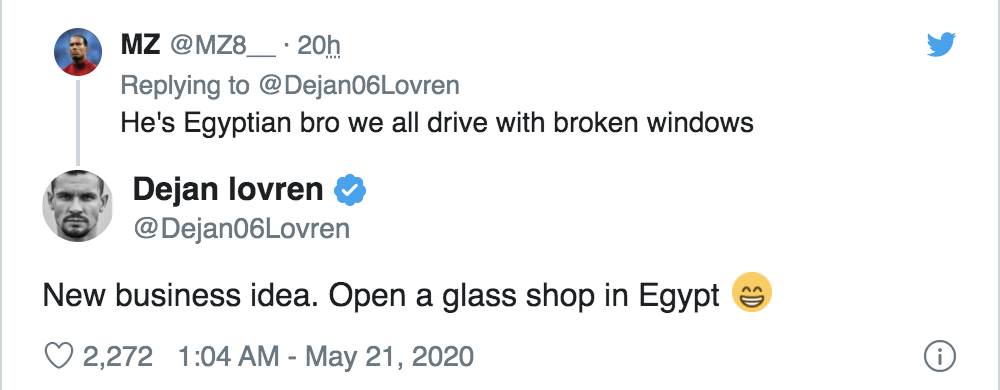وقال لوفرين: “"نعم، ولكن مع نافذة مكسورة" قبل أن يرد أحد المعجبين على لوفرين قائلًا: "إنه مصري يا أخي، كلنا نقود والنوافذ مكسورة".