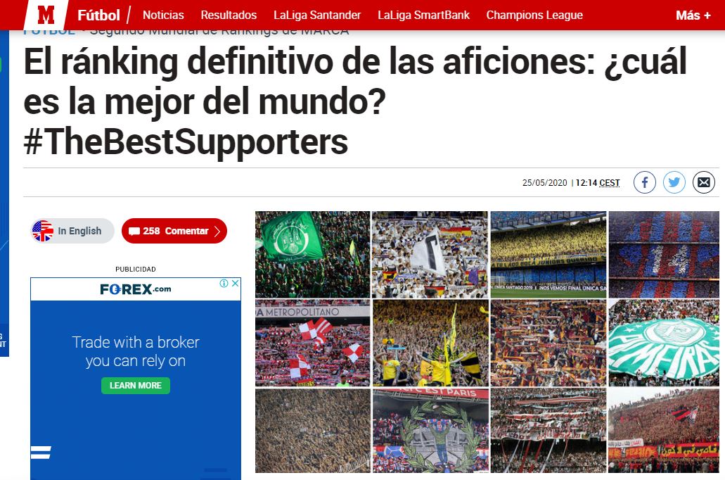 يتصدر جمهور نادي الرجاء المغربي استفتاء صحيفة "ماركا" الإسبانية لأفضل جمهور في العالم، بمشاركة 40 فريقاً، بعد أن حصد 2.7 ملايين صوت، متفوقاً على الأهلي المصري أقرب منافسيه على اللقب، الذي حصد 442 ألف صوت، ولا يزال التصويت مفتوحاً منذ أسبوع دون أن تحدد الصحيفة موعداً لانتهاءه.