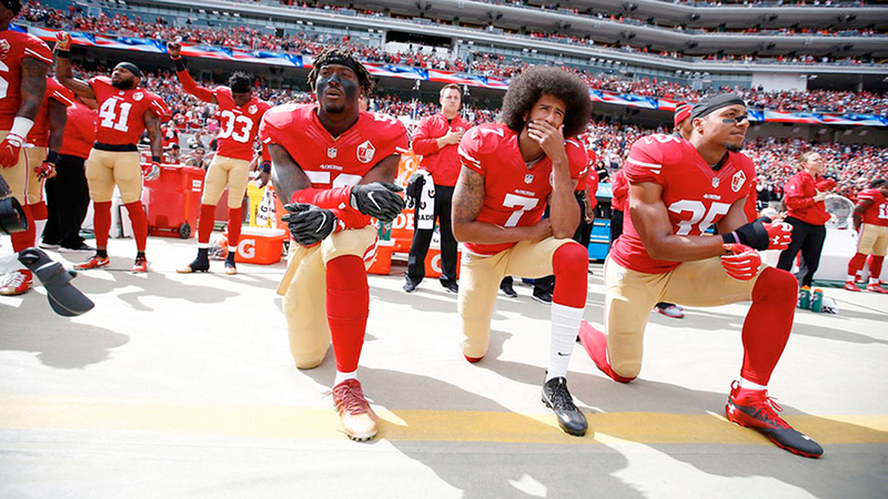 حركة لاعب كرة القدم الأميركية كولين كابيرنيك الداعمة لمظاهرة العدالة الاجتماعية. ■ من المصدر