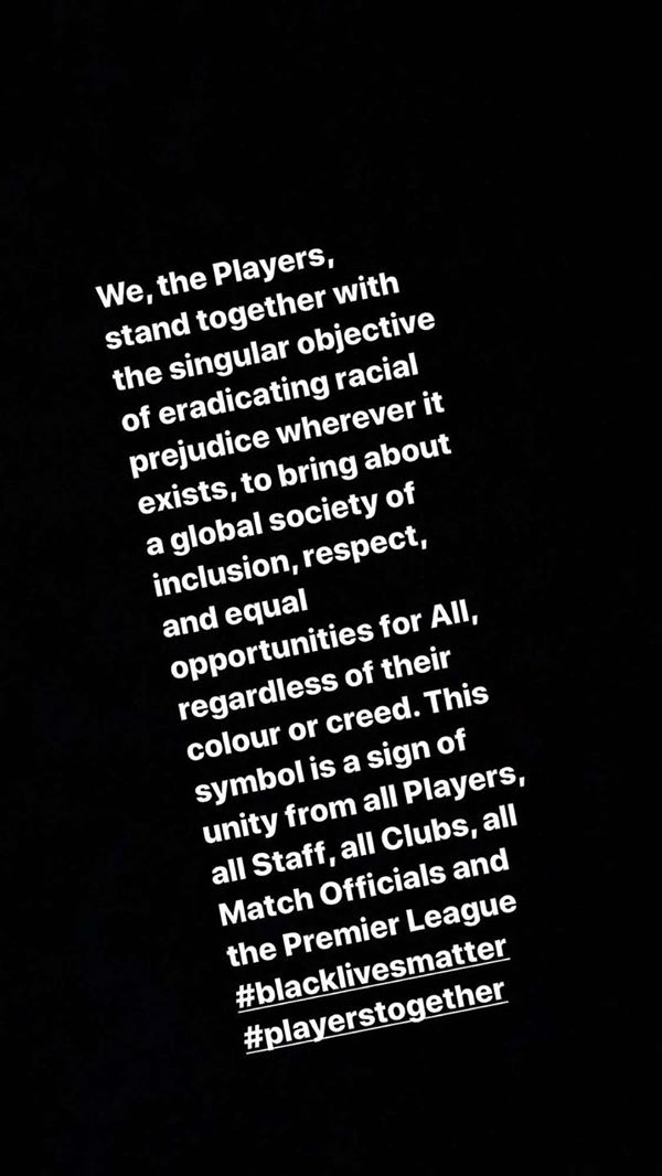 وقال محمد صلاح عبر خاصية "استوري": "نحن نتكاتف جميعا من أجل القضاء على التمييز العنصري أينما كان ونريد أن يكون المجتمع قائما على المساواة والاحترام بغض النظر عن اللون أو العقيدة، ما يحدث يحتاج إلى تكاتف جميع أعضاء منظومة كرة القدم، من لاعبين وحكام ومدربين ومسؤولين، حتى نرد بقوة على ما يحدث داخل الملاعب وخارجها".