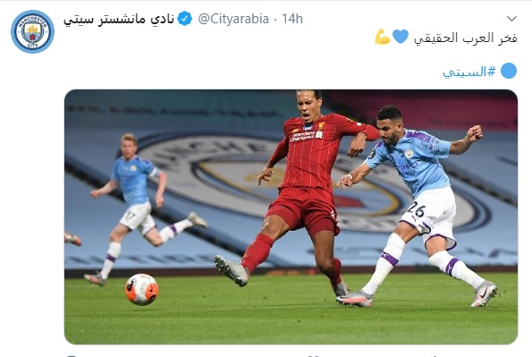 كتب الحساب الرسمي لنادي مانشستر سيتي الإنجليزي، باللغة العربية، بموقع التواصل الاجتماعي «تويتر» عبارة: «فخر العرب الحقيقي»، مرفقة بصورة نجم الفريق، الجزائري رياض محرز، وذلك بعد الفوز العريض، الذي حققه «السيتيزن» على «الريدز»، أمس الخميس، برباعية نظيفة في ملعب الاتحاد.