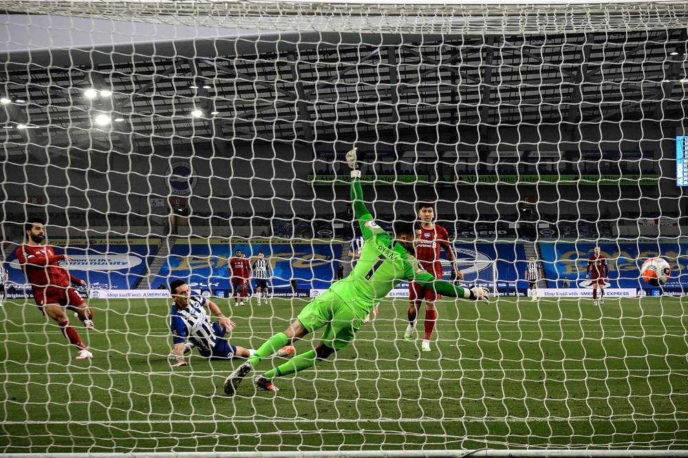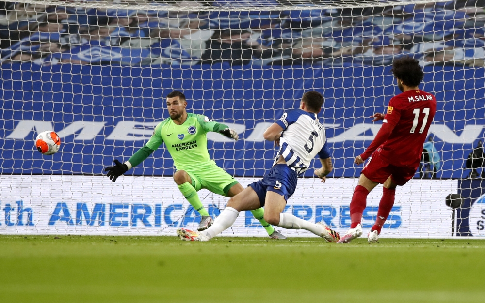 وبعد فشله في الوصول الى الشباك في أي من مبارياته الخمس الماضية خارج ملعبه في جميع المسابقات، ضرب ليفربول بقوة أمام برايتون بتسجيله هدفين بعد ثماني دقائق فقط، الأول عبر صلاح الذي وصلته الكرة من نابي كيتا بعد أن خطفها الغيني إثر خطأ في السيطرة عليها من دايفي بروبر، فمررها عرضية لتصل الى البرازيلي روبرتو فيرمينو الذي فضل تركها لصلاح، فسددها الأخير في الشباك.