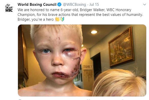 وقال مجلس الملاكمة العالمي على حسابه الرسمي في موقع التواصل الاجتماعي "تويتر": "يشرفنا منح البطولة الفخرية للقب المجلس إلى البطل الصغير الأميركي بريدجر والكر تكريما لشجاعته التي تمثل أفضل القيم الإنسانية".