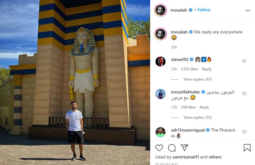 نشر نجم ليفربول الإنجليزي، المصري محمد صلاح صورة له أمام أحد التماثيل الفرعونية القديمة في إنجلترا، علق عليها عبر حسابه في موقع التواصل الاجتماعي "إنستغرام": "نحن متواجدون في كل مكان".