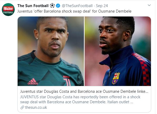 كشفت صحيفة "صن" البريطانية عن صفقة تبادلية مرتقبة بين برشلونة ويوفنتوس خلال فترة الانتقالات الصيفية الحالية يتم بموجبها حصول "السيدة العجوز" على خدمات اللاعب الفرنسي عثمان ديمبلي مقابل رحيل الجناح الطائر البرازيلي دوغلاس كوستا إلى النادي الكاتالوني.