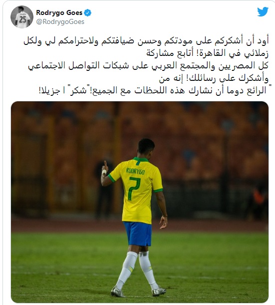 ونشر رودريغو على حسابه الرسمي في موقع التواصل الاجتماعي "تويتر" رسالة باللغة العربية، قال فيها: "أود أن أشكركم على مودتكم وحسن ضیافتكم ولاحترامكم لي ولكل زملائي في القاهرة! أتابع مشاركة كل المصریین والمجتمع العربي على شبكات التواصل الاجتماعي وأشكركم على رسائلكم! إنه من الرائع دوما أن نشارك هذه اللحظات مع الجمیع، شكراً جزیلاً".