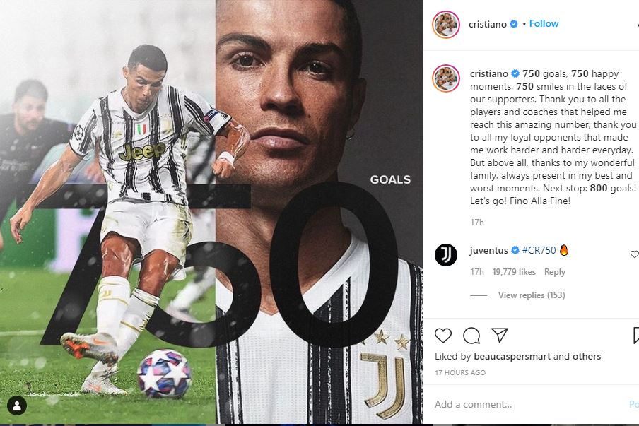 وجه نجم وهداف يوفنتوس الإيطالي، البرتغالي كريستيانو رونالدو رسالة شكر للاعبين بمختلف الأندية والمدربين الذين أسهموا في نجاحاته وصولاً إلى تحقيق الإنجاز الكبير يتسجيله الهدف رقم 750 في مسيرته الحافلة.