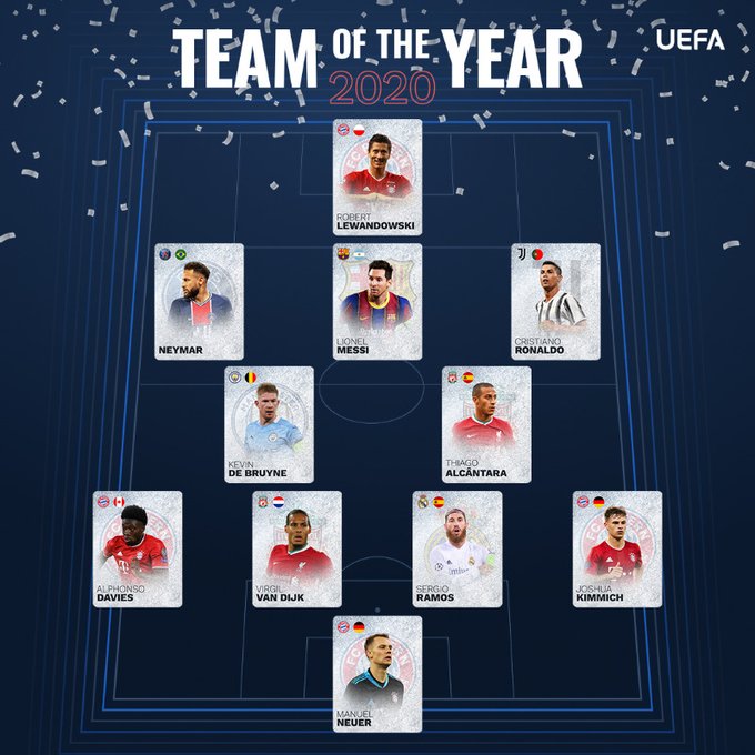 وسيطر في التشكيلة لاعبو البايرن، إذ ظهر في حراسة المرمى الألماني مانويل نيوير، والكندي ديفيز والألماني كيميتش، ولاعب الوسط الاسباني ألكانتارا، بينما في الدفاع كان الإسباني سيرجيو راموس، وظهر ليفربول من خلال صخرة دفاعه الهولندي فان دايك، وفي الوسط الهجومي البلجيكي دي بروين.