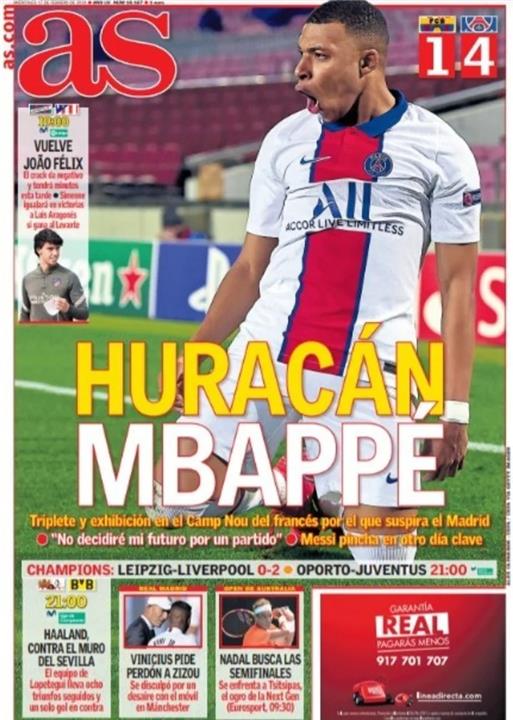 من جهتها، قالت صحيفة "آس" الإسبانية: "عاصفة مبابي، هاتريك وأداء مبهر من الفرنسي في كامب نو أمام أنظار ريال مدريد، مع سقوط ميسي في يوم مهم آخر".