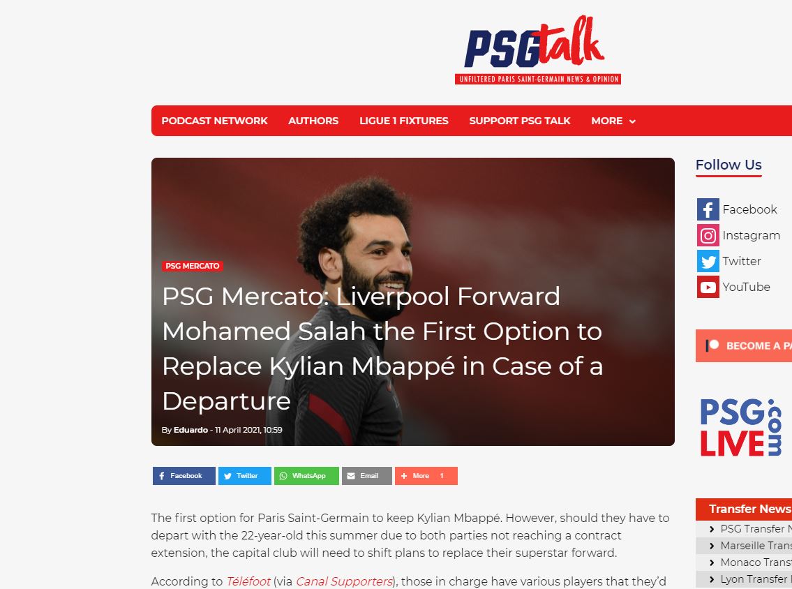 كشف الحساب الرسمي لشبكة "بي إس جي توك" الفرنسية على "تويتر" أن نادي باريس سان جيرمان يسعى إلى التعاقد مع المصري محمد صلاح نجم ليفربول الانجليزي في حال لم يتمكن من تجديد عقد الفرنسي كيليان مبابي الذي بدوره أبلغ ناديه بالرحيل نهاية الموسم الحالي وسط أنباء عن اقترابه من التوقيع لريال مدريد.