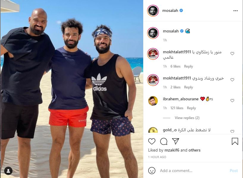 نشر النجم المصري محمد صلاح على حسابه في موقع التواصل الاجتماعي "إنستغرام" صورة له أمام أحد شواطئ مدينة العلمين بمحافظة مطروح حيث يقضي إجازته الصيفية، ويظهر فيها منفرداً بالشاطئ الأمر الذي أثار صديقه لاعب أولمبياكوس اليوناني ومنتخب مصر أحمد حسن "كوكا".