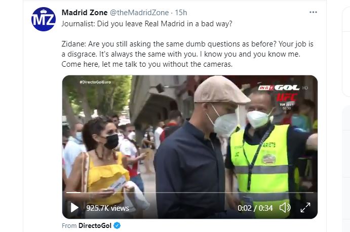Zidane: Are you still asking the same dumb questions as before? Your job is a disgrace. It's always the same with you. I know you and you know me. Come here, let me talk to you without the cameras.pic.twitter.com/ZZpXrUDALo
