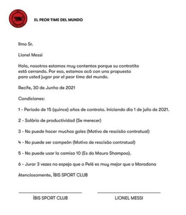 وقدم نادي إيبيس الذي يطلق على نفسه لقب "أسوأ فريق في العالم"، عقداً غريب الأطوار لضم ميسي (34 عاماً) بشروط غريبة للغاية نشرها عبر حسابه في "تويتر"، إذ يريد النادي البرازيلي المغمور من ميسي التوقيع على كشوفاته 15 عاماً، على أن يعتمد الراتب الذي سيحصل عليه على إنتاجية التسجيل وعدد الأهداف، كما هناك بند في العقد لا يمكنه تسجيل أهدافاً فوق المسموح بالعقد لأنه سيكون سببا لإنهاء التعاقد بينهما.