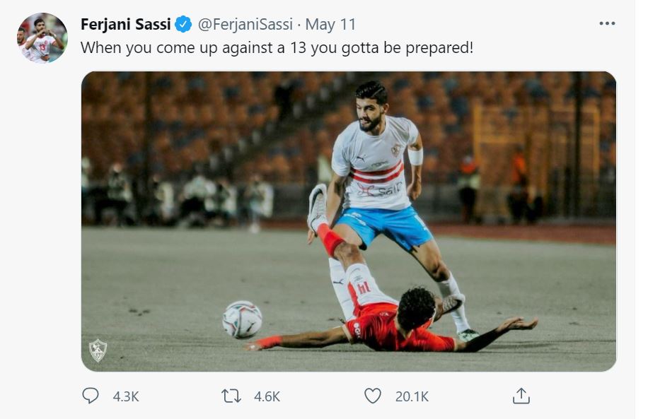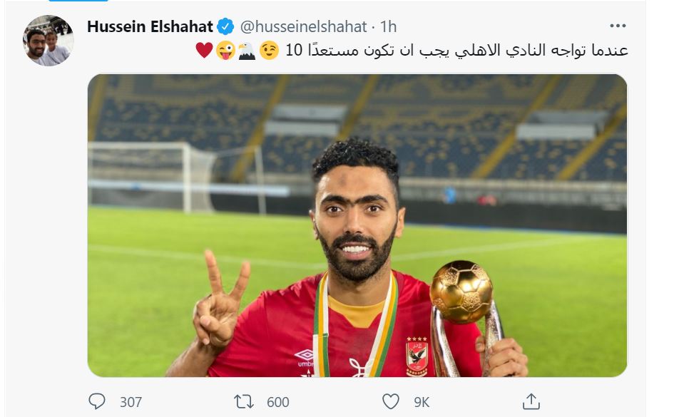 وغرّد الشحات على حسابه في "تويتر": "عندما تواجه النادي الأهلي يجب أن تكون مستعدا.. 10"، في إشارة إلى فوز الأهلي باللقب القاري العاشر في تاريخه، وذلك ردأً على تغريدة سابقة للاعب ساسي تعود إلى تاريخ يوم 11 مايو الماضي نشر خلالها صورة له وهو يراوغ الشحات وكتب عليها: "عندما تواجه الرقم 13 يجب أن تكون مستعدا".