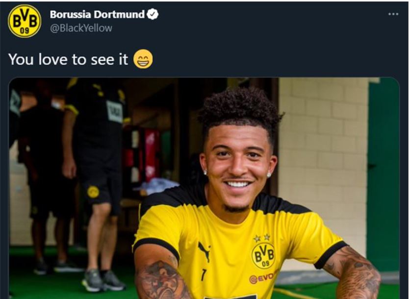 وكتب بروسيا دورتموند صورة سانشو: "تحب أن ترى ذلك"، في إشارة إلى تمسكه باللاعب ومحاولة استفزاز مانشستر يونايتد الذي كان متلهفاً لإبرام الصفقة لكن مغالاة دورتموند أوقفت الصفقة آنذاك، ولكن مرّ الزمن وتمكن النادي الإنجليزي من نيل مراده بإتمام الصفقة وفور التوقيع مع سانشو نشر صورة اللاعب بالقميص الأحمر مع تعليق: "أنت تحب أن ترى ذلك"!، وكأنه يطبق المقولة الشهيرة: العين بالعين و البادئ أظلم.