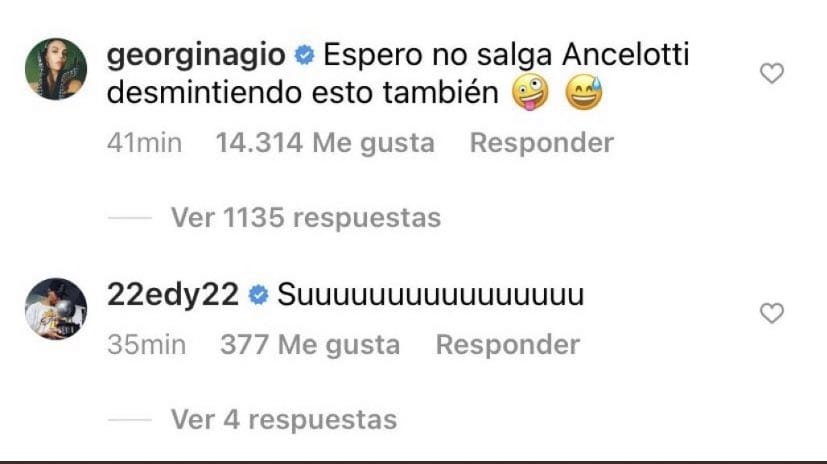 وخرجت جورجينا عبر حسابها الرسمي في برنامج "إل شيرينغيتو" الإسباني على إنستغرام لتنقد المدرب بلهجة ساخرة قائله: "أتمنى ألا يخرج أنشيلوتي وينفي هذا أيضا".