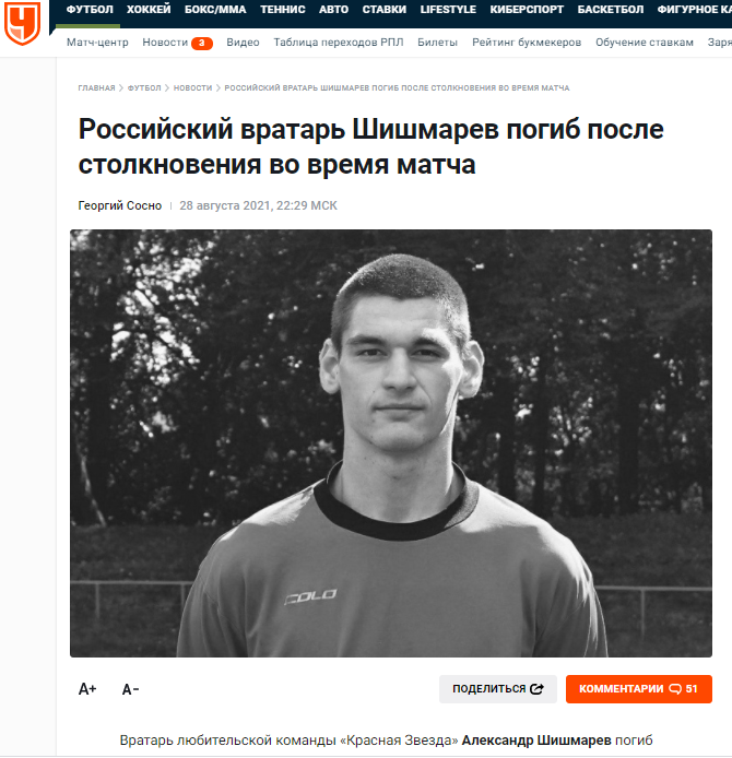 وقالت صحيفة "سبورت أكسبريس" عن رئيس اتحاد كالينينغراد لكرة القدم ألكسندر غفارديس أن وفاة حارس المرمى ألكسندر شيشماريف قد تكون ناجمة عن اختناقه بعد تعرضه لإصابة خلال مباراة أمس السبت، مشيراً إلى أن الحارس شيشماريف، حاول اعتراض الكرة واصطدم بلاعب من الفريق المنافس مما أدى إلى سقوطه بشكل غير موفق على الأرض، ووفقا للبيانات الأولية، فقد تعرض لبلع اللسان واختنق.