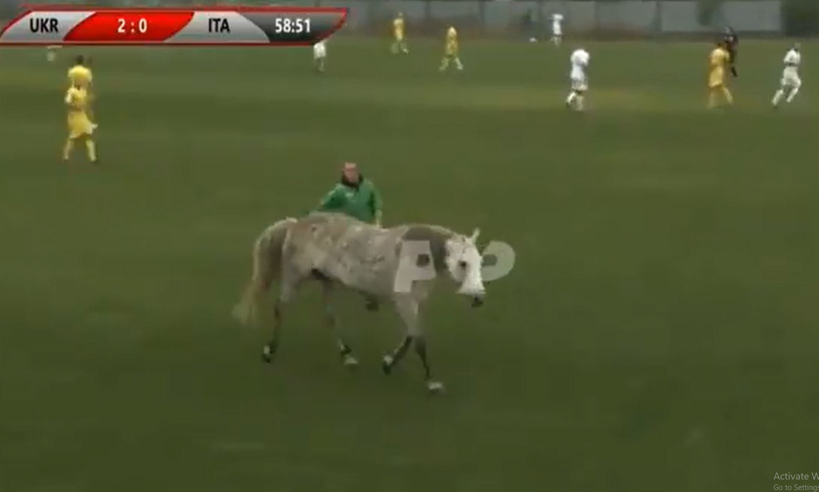 وذكرت قناة روسيا اليوم بأن المباراة توقفت مرتين، الأولى عند الدقيقة 41، بعد ظهور كلبين داخل المستطيل الأخضر، لتستكمل المباراة بعد أن تمكن ممثلو المنتخب الأوكراني من طرد الحيوانين وإخراجهما من الميدان، والمرة الثانية كانت عند الدقيقة 59 بينما كان المنتخب الأوكراني متقدما بهدفين دون رد، لتتوقف المواجهة مجدداً بسبب اقتحام حصان أبيض لأرضية الملعب، وسرعان ما تمكن المسؤولون أيضا من إخراجه من الميدان.
