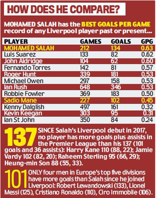 وأحرز محمد صلاح 134 هدف مع ليفربول في 212 مباراة في كل البطولات بمعدل 63. هدف في كل مباراة، ليتفوق على لويس سواريز، صاحب المركز الثاني بمعدل 62. هدف في المباراة بعدما أحرز 82 هدفا في 133 مباراة، بينما جاء ساديو ماني في مركز متأخر بـ 102 هدف في 227 مباراة ومعدل 45. هدف في كل مباراة، وتفوق صلاح على أسطورة ليفربول ايان رش، الذي خاض مع ليفربول 648 مباراة وسجل 346 هدف بمعدل 53. هدف في كل مباراة.