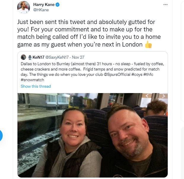 ولكن المفاجئة الكبرى جاءت من نجم توتنهام هاري كين الذي تفاعل مع التغريدة لتعويض المشجع عما حصل له، فقال علة حسابه في "تويتر": "لقد تلقيت تلك التغريدة للتو، وأشعر بالإحباط من أجلك، من أجل التزامك وتعويضا للمباراة التي تم تأجيلها، أود أن أدعوك إلى مباراة في ملعبنا كضيفي عندما تحل بعد ذلك في لندن".