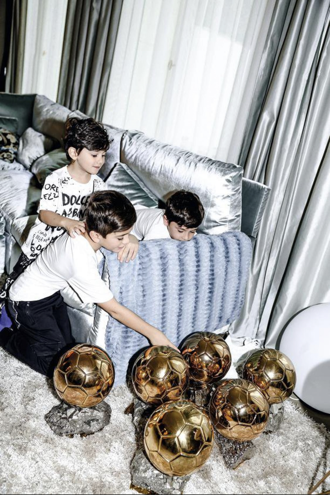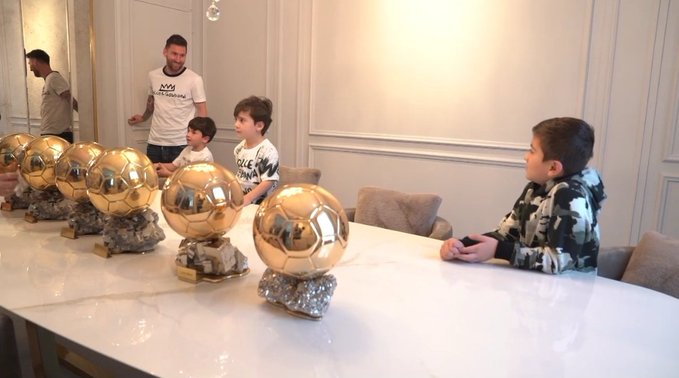 تداول رواد مواقع التواصل الاجتماعي صوراً للنجم الأرجنتيني ليونيل ميسي وأولاده وزوجته وهم محاطون بالكرات الذهبية السبع التي توج بها البرغوث خلال مسيرته الكروية التي بدأت فصلاً جديداً مع ناديه باريس سان جيرمان بعدما رحل عن بيته الأم برشلونة.