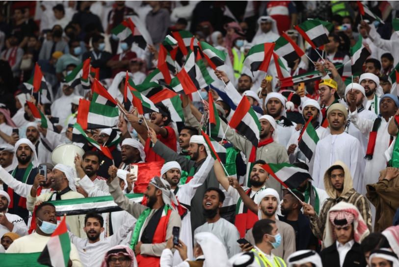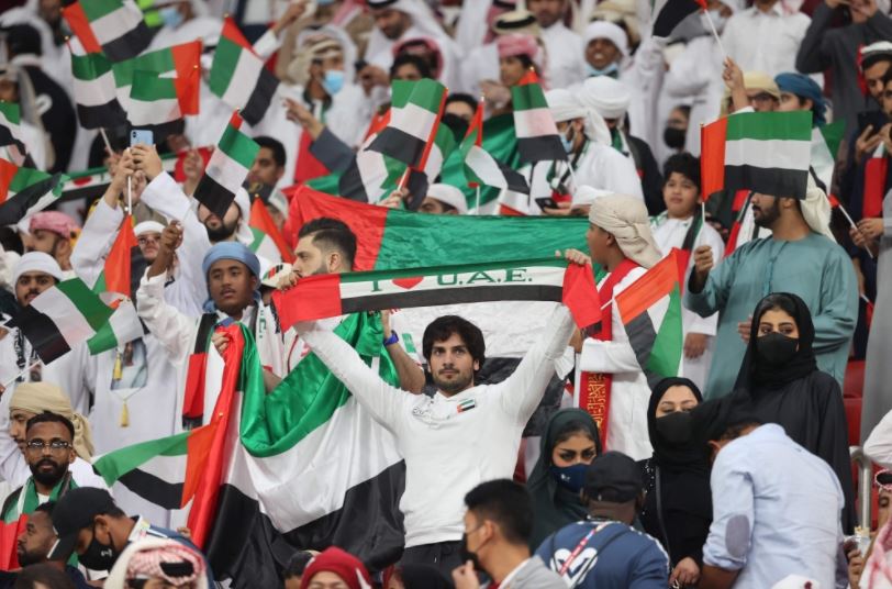 سجل الجمهور الإماراتي حضوراً لافتاً في ستاد البيت بالعاصمة القطرية الدوحة، خلال المباراة التي جمعت المنتخب الوطني مع نظيره القطري، اليوم الجمعة، في دور ربع النهائي من كأس العرب 2021.