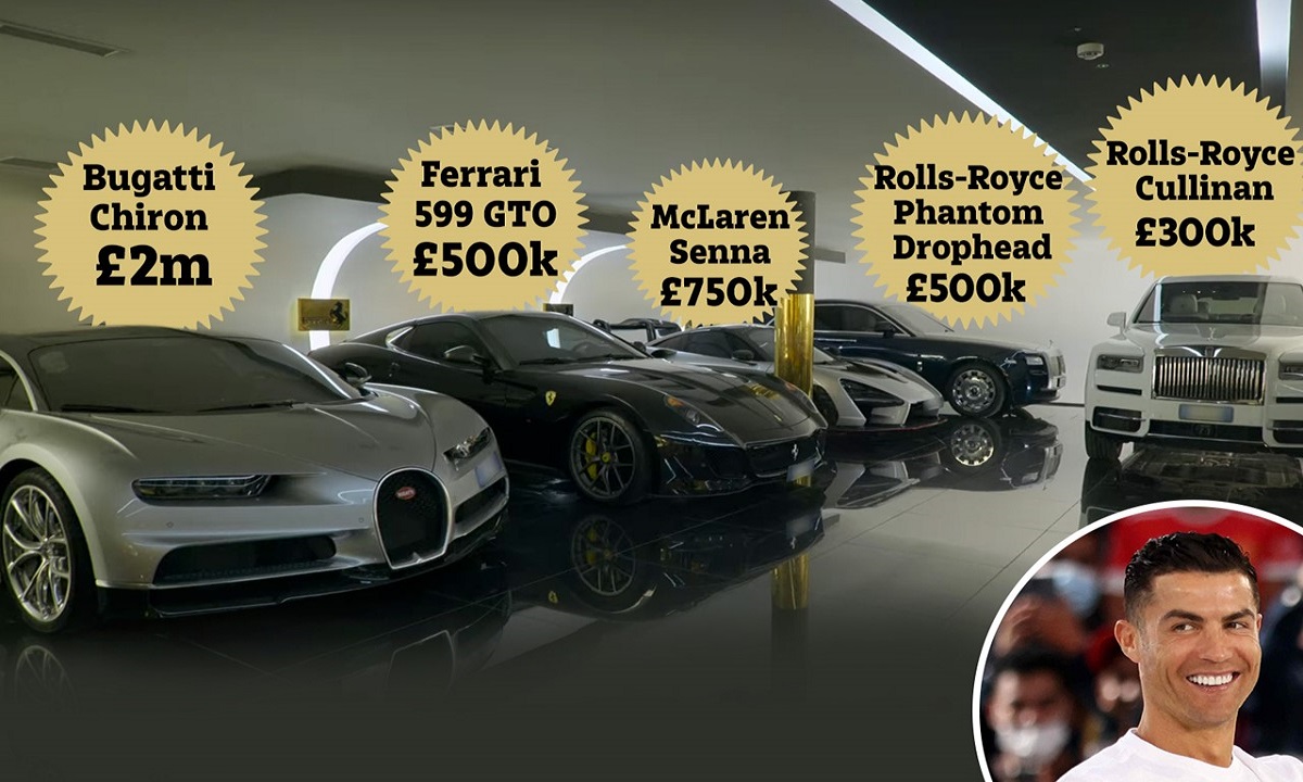 وضم الأسطول، سيارة بوغاتي تشيرون رونالدو 2 مليون جنيه إسترليني على الأقل، تليها سيارته Ferrari 599 GTO، وتقدر قيمتها بـ 500.000 جنيه إسترليني، ثم McLaren Senna بقيمة 750.000 جنيه إسترليني.