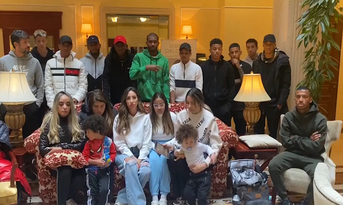 -ظهر مجموعة من لاعبي كرة القدم البرازيليين الذين يلعبون في أندية أوكرانية وعائلاتهم، ويطلبون المساعدة من الحكومة البرازيلية لإجلائهم، في فندق في كييف، في 24 فبراير 2022، بعد الغزو الروسي.