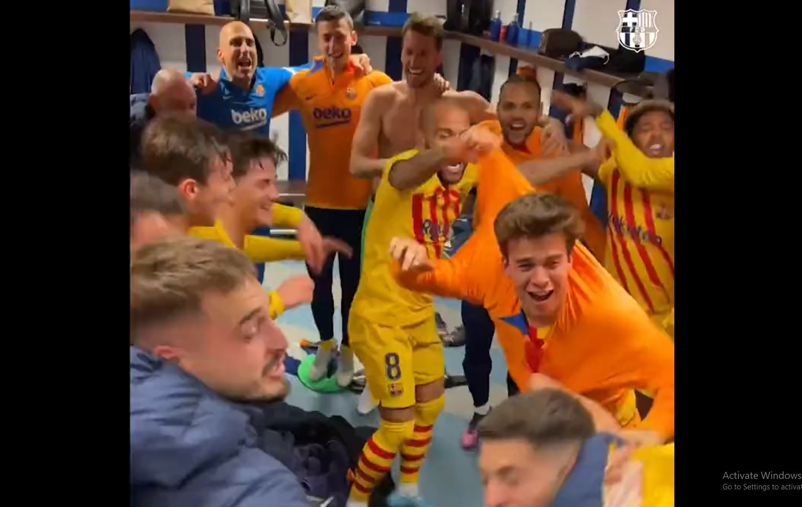 نشر الحساب الرسمي لنادي برشلونة على "تويتر" مقطع فيديو من الأفراح الهستيرية للاعبي الفريق الكاتالوني في غرفة تبديل الملابس بعد الانتصار التاريخي على غريمهم ريال مدريد وفي عقر داره "سانتياغو برنابيو" برباعية نظيفة، الأحد، ضمن الجولة 29 من الدوري الإسباني لكرة القدم.