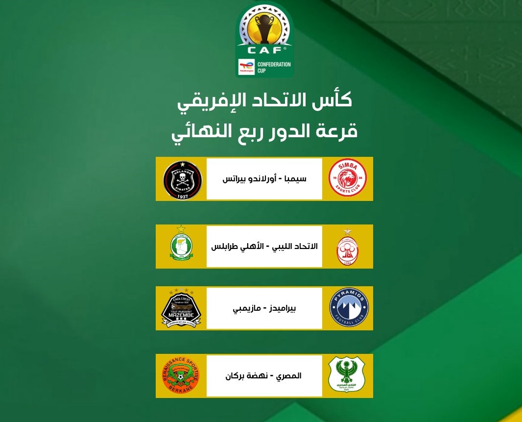 أفرزت قرعة الدور ربع النهائي لمسابقة كأس الاتحاد الإفريقي في كرة القدم التي سحبت الثلاثاء في القاهرة مواجهة ليبية بين الاتحاد والأهلي وشمال إفريقية بين المصري البورسعيدي المصري ونهضة بركان المغربي.