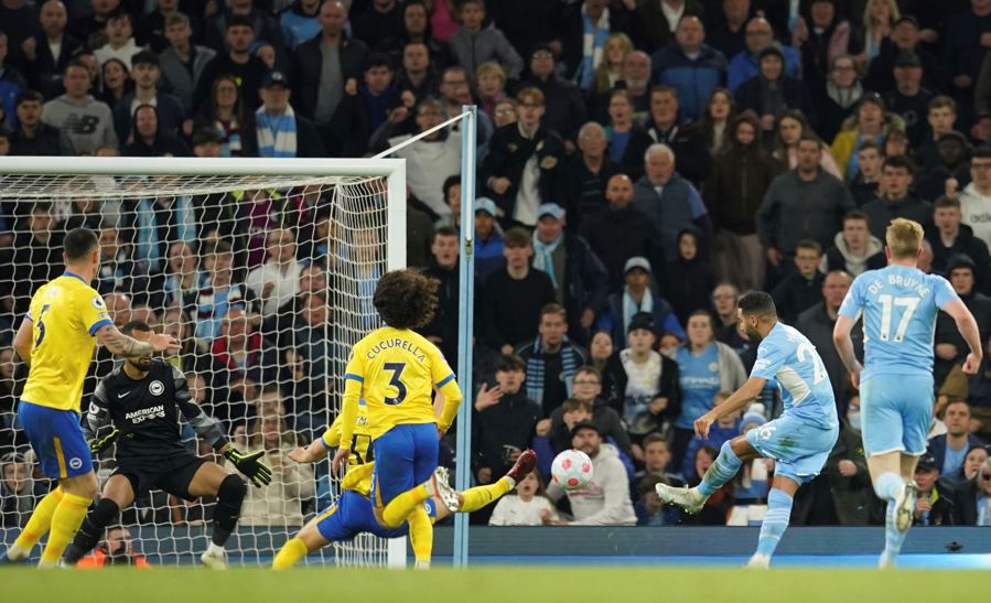 أحرز النجم الجزائري الدولي رياض محرز هدفا في مرمى برايتون وصنع آخر، ليقود فريقه مانشستر سيتي لاستعادة صدارة جدول ترتيب الدوري الإنجليزي لكرة القدم، بفوزه 3 / صفر على الفريق الملقب بـ(طيور النورس)، اليوم في مباراة مؤجلة من المرحلة الثلاثين للمسابقة.