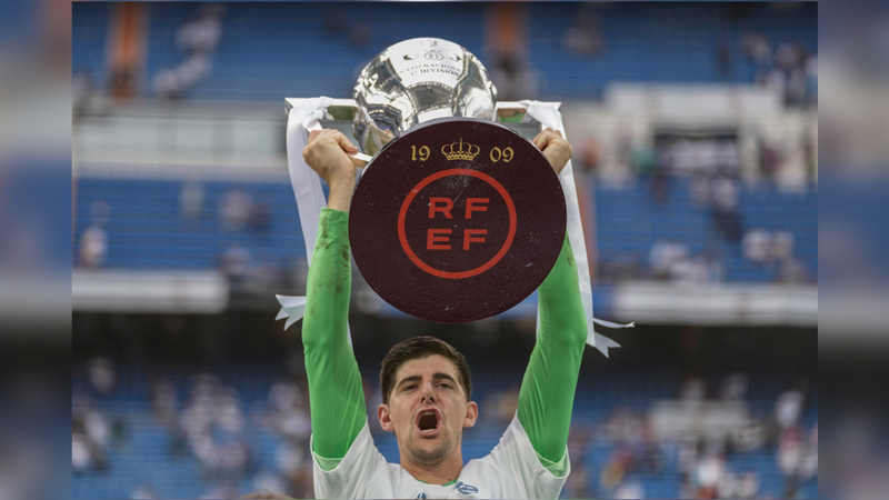 تيبو كورتوا يحتفل بالدوري الإسباني. أ.ب
