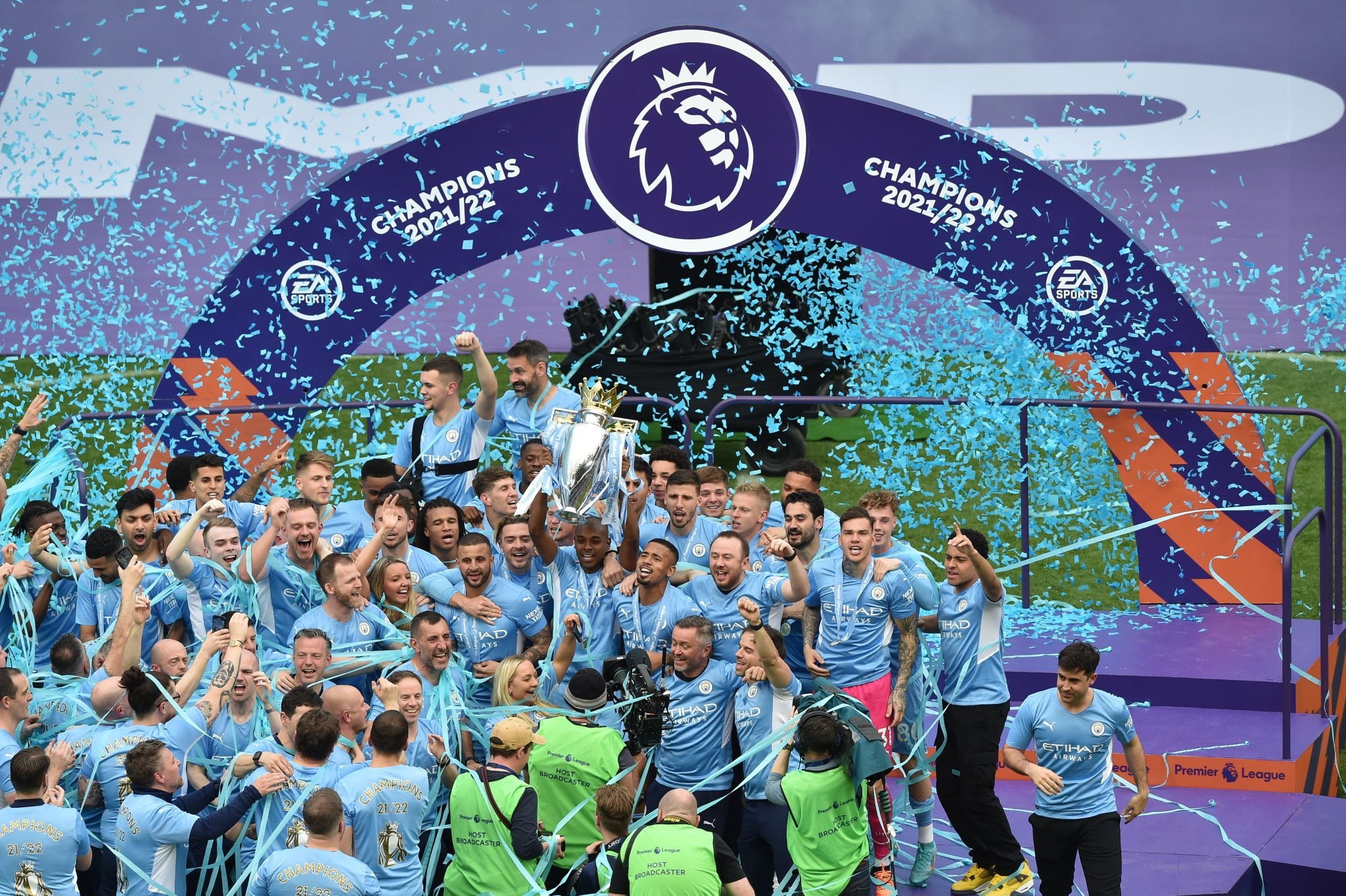 سيطرت حالة من الفرحة الكبيرة على لاعبي فريق مانشستر سيتي والمدير الفني غوارديولا بعد التتويج بلقب بلقب الدوري الإنجليزي الممتاز لكرة القدم للمرة الثامنة في تاريخه بعدما قلب تأخره بهدفين نظيفين أمام ضيفه أستون فيلا إلى فوز 3 / 2 ، اليوم الأحد في الجولة الثامنة والثلاثين الأخيرة من المسابقة، والتي شهدت أيضا فوز ليفربول على وولفرهامبتون 3 / 1.